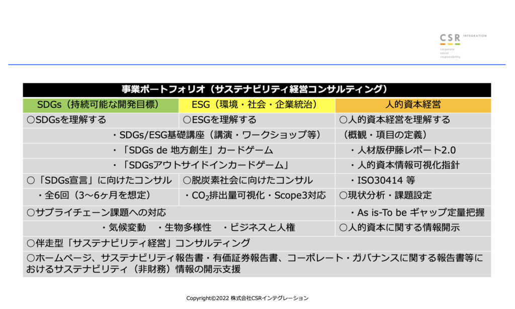 株式会社CSRインテグレーションは、企業のSDGs/ESG経営および人的資本経営の実践に向けたサステナビリティ経営コンサルティングを行っています。